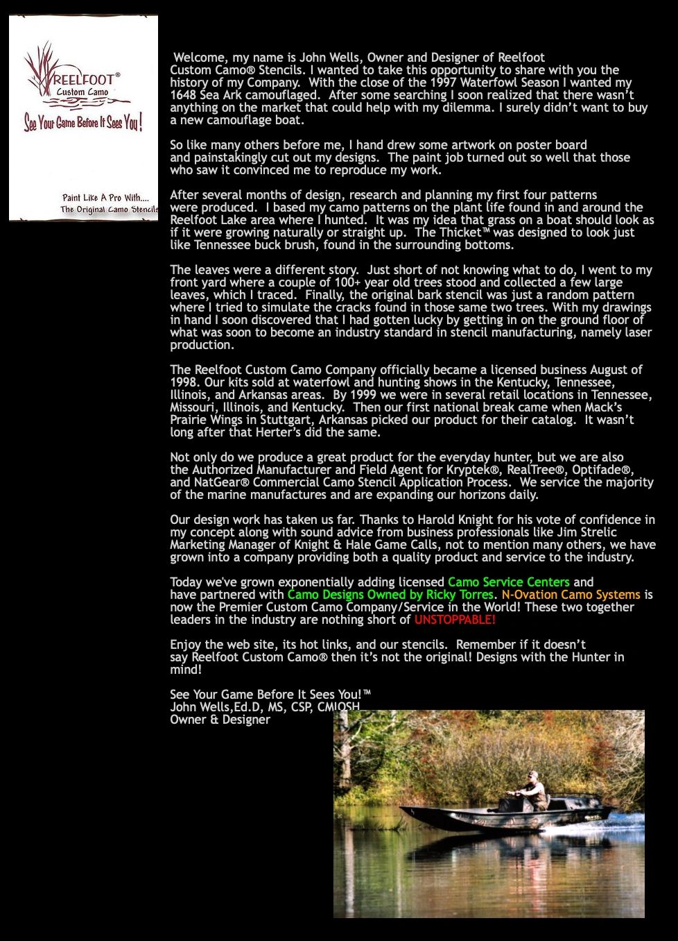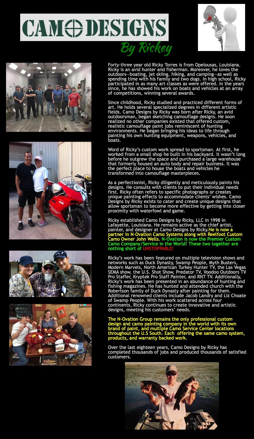 N-ovation’s roots began in the late 1990's and continues today. N-ovation is the culmination of over 45 years of stencil design and custom camo paint application brought to you by Reelfoot Custom Camo® and Camo Designs by Ricky, LLC.